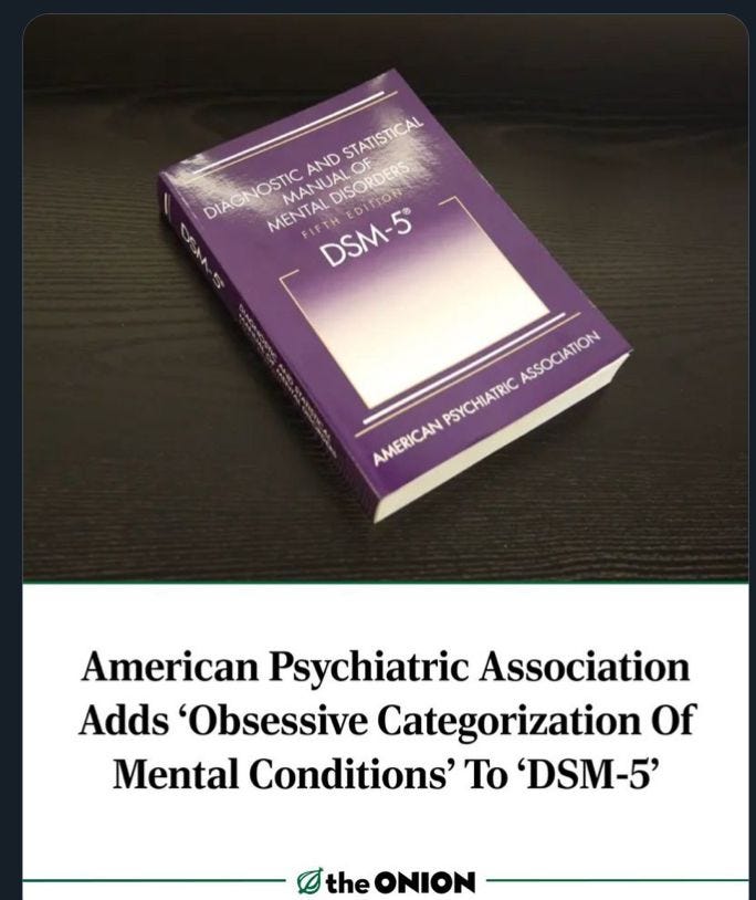 The book in the amusing image above is the fifth edition of the Diagnostic Statistical Manual (DSM-V). It contains all the mental disorders that the American Psychiatric Association thinks we have.